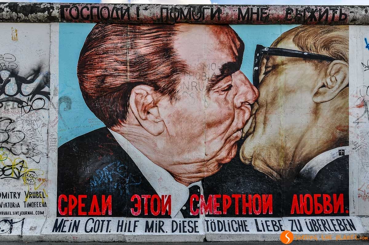 East Side Gallery, es un lugar único en el mundo. Un tramo de 1,3 kilómetros del Muro de Berlín decorado con cientos de graffitis que retratan la Guerra Fría. Es uno de los lugares más fascinantes que ver en Berlín y pasamos allí un buen rato contemplando cada uno de los graffitis. Gábor, al haber crecido en un país comunista, ha visto muchos de ellos en carteles o en anuncios de televisión. Son pinturas creadas durante la caída del muro que expresan aspectos grotescos de la dictadura. La imagen más conocida es el beso entre dos dictadores, Leonid Brezhnev de URSS y Erich Honecker de la RDA.